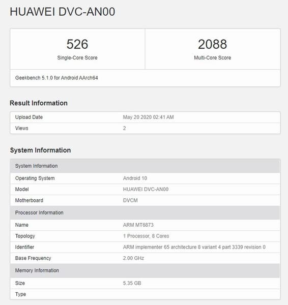 Huawei DVC-AN00 набрал 526 баллов в однопоточном тесте и 2088 баллов в многопоточном — это примерно две трети от того, на что способна Snapdragon 865. Также видно, что смартфон получил 6 ГБ оперативной памяти и ОС Android 10.