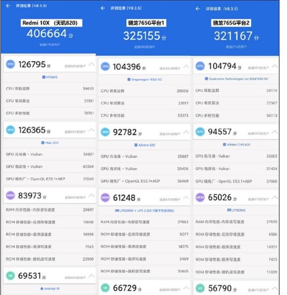 Теперь же появились сравнительные результаты тестирования Dimensity 820 и Snapdragon 765G в популярном бенчмарке AnTuTu, где новая платформа стабильно набирает более 400 тысяч баллов, опережая Snapdragon 765G, результат которой составляет 320-325 тысяч баллов. Dimensity 820 уверенно опережает Snapdragon 765G в тестах центрального процессора, графического ускорителя и памяти.