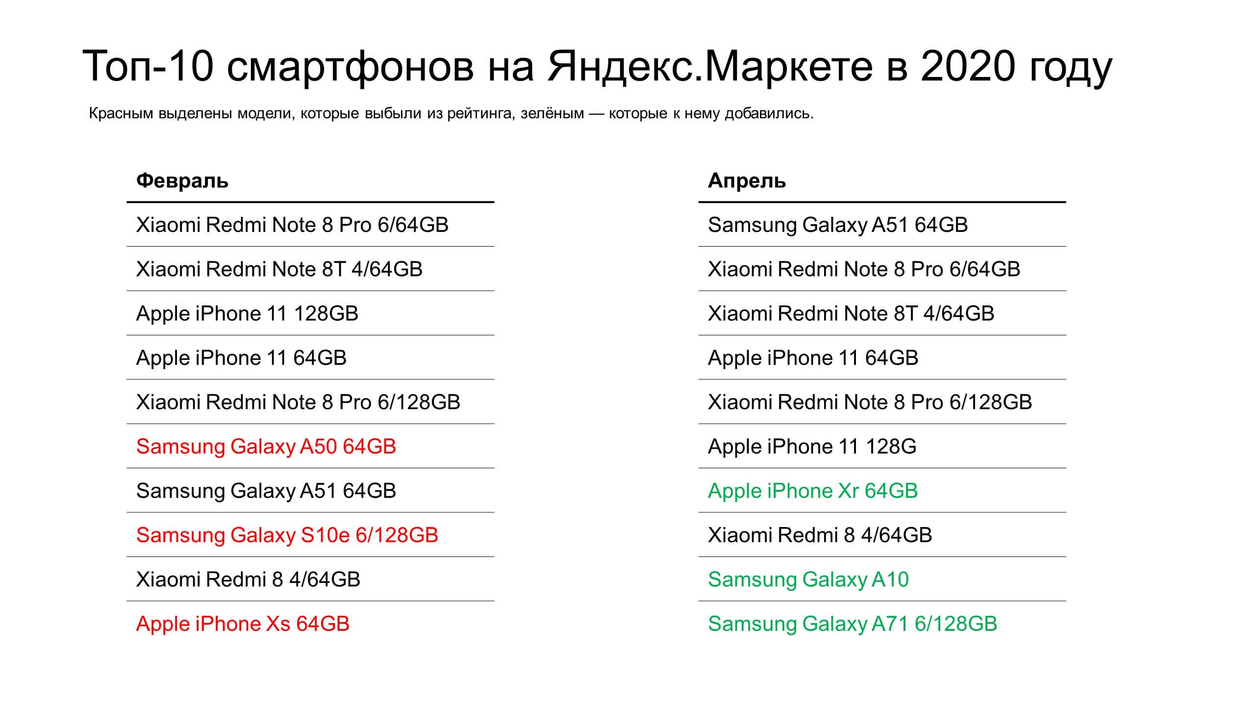 Смартфон Samsung Galaxy A51 64 ГБ занял в апреле первое место (средняя цена 19 тысяч), хотя в феврале был на седьмом. Он опередил прошлого лидера, Redmi Note 8 Pro (средняя цена 17 тысяч). По мнению аналитиков, Galaxy A51 и Samsung Galaxy A71 были представлены в начале года, что и обусловило их объясняет их попадание в рейтинг.
