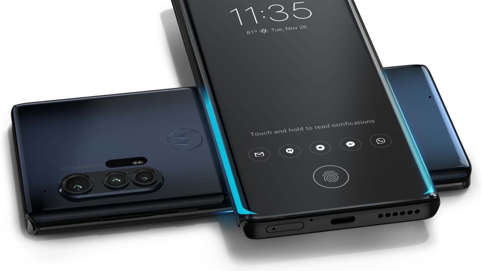 Экран Motorola Edge+ имеет диагональ 6,7 дюйма и разрешение FHD+, а также частоту обновления 90 Гц и поддержку расширенного динамического диапазона HDR+. В левом верхнем углу располагается врезанная в экран фронтальная камера разрешением 25 Мп. Motorola Edge+ оснащен однокристальной системой Snapdragon 865 с модемом Snapdragon X55 5G и поддержкой ммWave 5G, что обеспечивает скорость загрузки данных до 4 Гбит/с, а также 12 ГБ быстрой оперативной памяти LPDDR5 и 256 ГБ флэш-памяти UFS 3.0. В основной камере установлены датчики разрешением 108, 16, 8 Мп. Есть оптический стабилизация и поддержка разрешения видео до 6K. Емкость аккумулятора составляет 5000 мА•ч, есть поддержка быстрой зарядки мощностью 18 Вт. Телефон также поддерживает беспроводную зарядку в обоих направления.