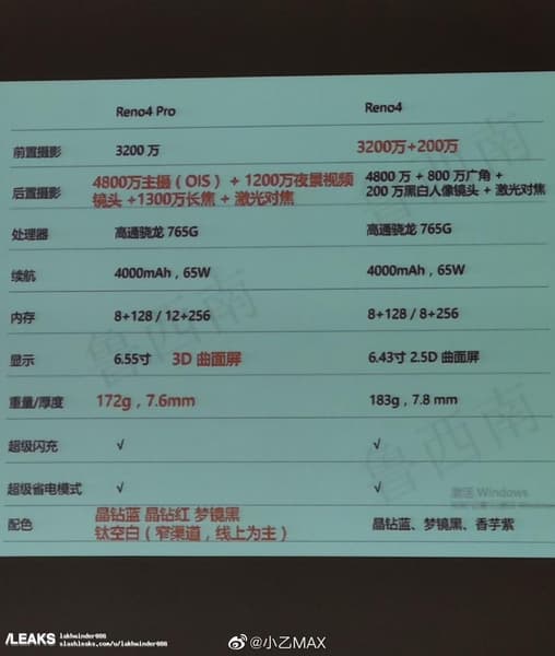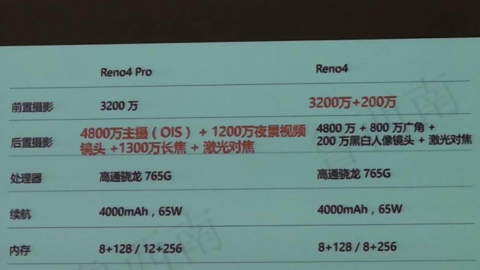 А теперь возвращаемся к слайду. Как видно, оба варианта Reno4 построены на однокристальной платформе Qualcomm Snapdragon 765G, оснащены аккумуляторами емкостью 4000 мА·ч с поддержкой быстрой зарядки мощностью 65 Вт. В Reno3, напомним, используется SoC MediaTek Dimensity 1000 с куда большим быстродействием.