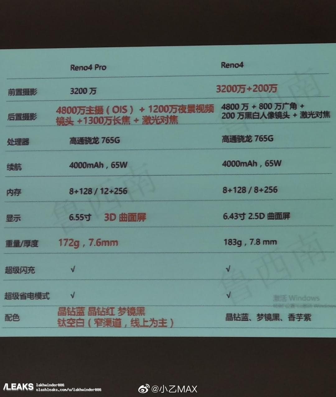 В Сети опубликованы характеристики двух перспективных смартфонов Oppo – Reno4 и Reno4 Pro. Учитывая практически флагманский статус Reno3, можно было ожидать чего-то такого и от новинок. Но, как видно на картинке, Reno4 и Reno4 Pro окажутся моделями среднего уровня.