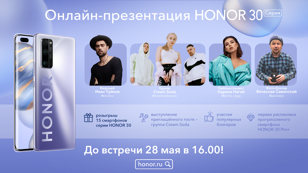Бренд Honor объявляет дату презентации серии флагманских смартфонов Honor 30. Мероприятие состоится 28 мая в 16:00 в формате онлайн-трансляции на официальном YouTube канале Honor. Во время онлайн-презентации зрители познакомятся со всеми особенностями новых устройств, а также побывают на онлайн-концерте популярной музыкальной группы Cream Soda.
