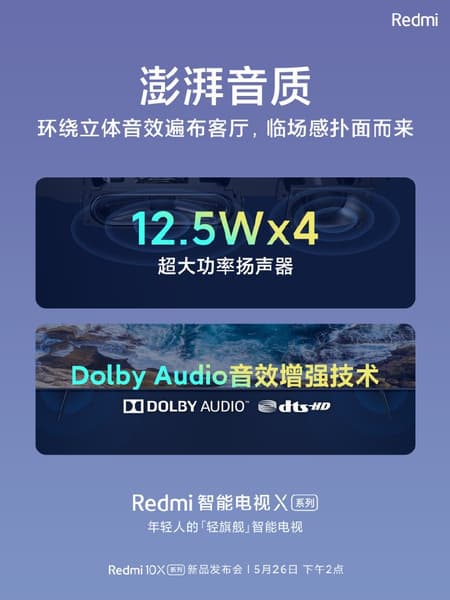 Второй постер подтверждает ранее появившуюся информацию о том, что телевизоры оснащены четырьмя динамиками мощностью по 12,5 Вт и поддерживают технологию Dolby Audio для создания эффекта объемного стереозвука.