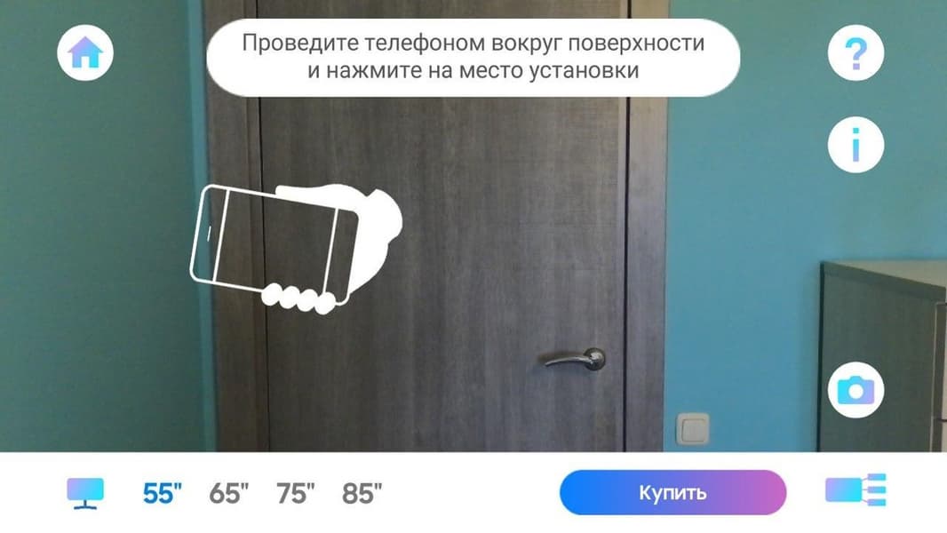 Приложение AR for Samsung TV использует технологию дополненной реальности, вам достаточно выбрать интересующую модель и отсканировать смартфоном поверхность, на которую вы планируете установить телевизор. Телевизор с масштабе 1:1 виртуально будет добавлен в комнату, после чего можно сделать несколько фотографий, чтобы затем сравнить различные варианты расположения и разные модели телевизоров в интерьере.