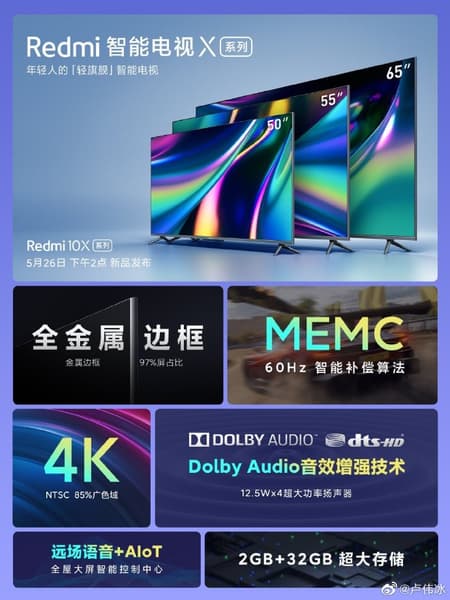 Глава Xiaomi Group China и генеральный директор Redmi Лу Вейбинг (Lu Weibong) оставил на своей страничке в социальной сети Weibo большой постер, подтверждающий основные характеристики линейки телевизоров Redmi X.