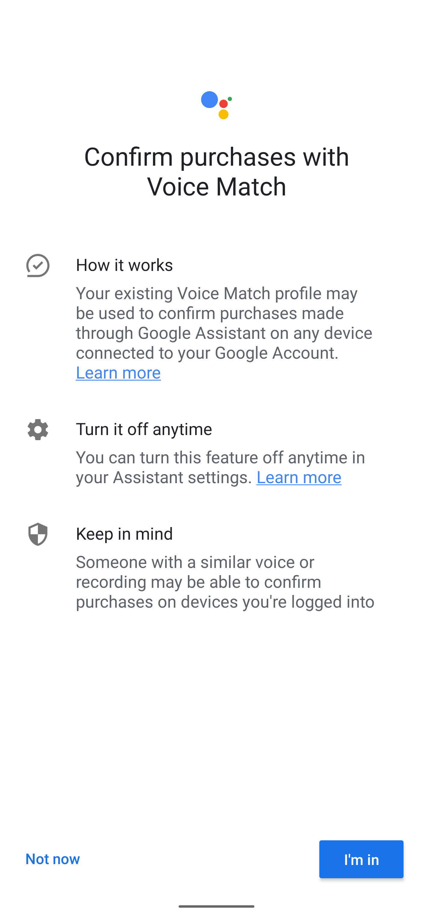 На официальной странице поддержки Google Assistant описывается, как активировать функцию Voice Match в голосовом помощнике. С её помощью можно совершать покупки, проходя верификацию и подтверждая платёж только с помощью голоса. Ранее такое подтверждение можно было дать с помощью отпечатка пальца или с распознованием лица.