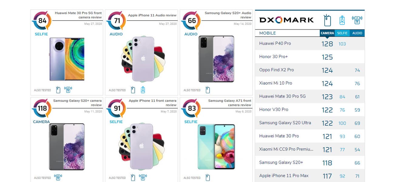 В данный момент лучшими камерофонами рейтинга DxOMark являются Huawei P40 Pro, Honor 30 Pro+, OPPO Find X2 Pro и Xiaomi 10 Pro. В рейтинге лучших селфи-камер лидируют Huawei P40 Pro, Huawei nova 6 5G, Samsung S20 Ultra. По качеству звука лучшими являютсяXiaomi 10 Pro и OPPO Find X2 Pro.