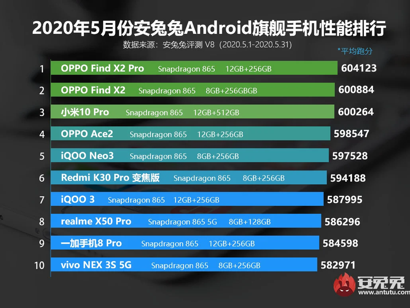 Команда бенчмарка AnTuTu опубликовала майский рейтинг самых производительных смартфонов на основе операционной системы Android в Китае. Он полностью заполнен моделями на основе однокристальной системы Qualcomm Snapdragon 865.