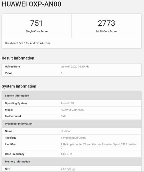 Также Honor Play4 Pro засветился в бенчмарке Geekbench, правда, не под своим торговым обозначением, а под каталожным номером OXP-AN00 (модель с этим же номером ранее засветилась в базах TENAA, 3C и Wi-Fi Alliance). Как видно, аппарат работает под управлением Android 10 и имеет 8 ГБ оперативной памяти. Однокристальная система, судя по результатам производительности и характеристикам – Kirin 990, дополненная фирменным модемом 5G.