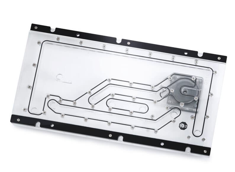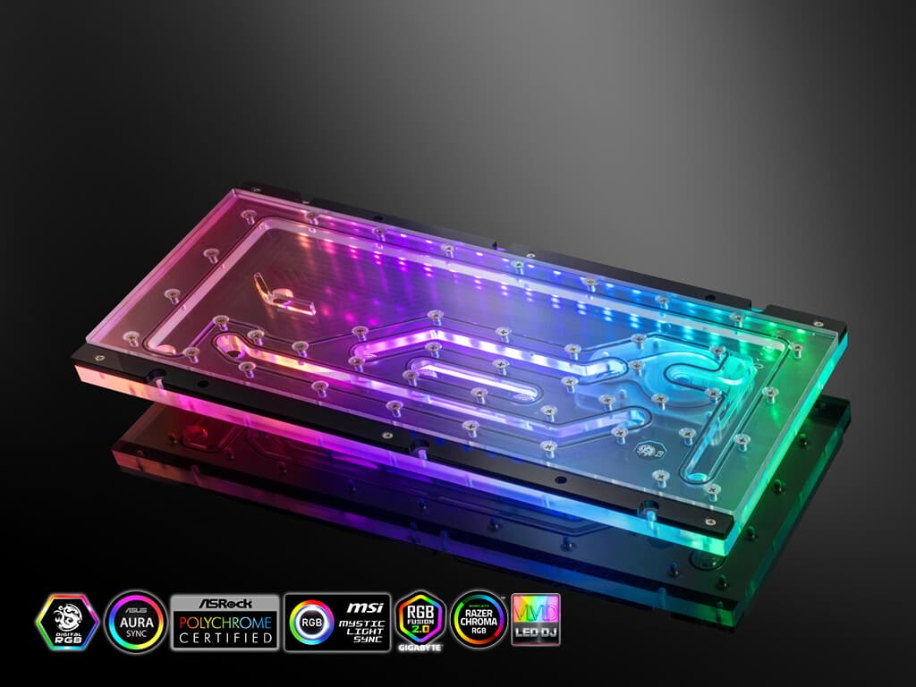 Резервуар-распределитель изготовлен из прозрачного акрилового пластика и украшен адресуемой светодиодной подсветкой RGB с 3-контактным разъемом ARGB. Порты расположены с таким расчетом, чтобы упростить подключение водоблоков графической карты и процессора, и уменьшить число изгибов жестких трубок. Порты для подключения радиатора расположены в верхней части, поскольку радиатор в Lian Li O11 Dynamic закрепляется на верхней панели. В нижней части на резервуаре смонтирована помпа. Габариты агрегата, равные 385 x 210,5 x 43,8 мм в точности соответствуют размерам передней панели корпуса.