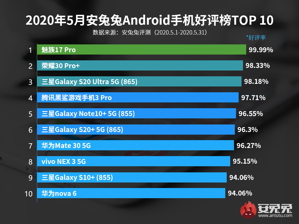 Первое место неожиданно занял новый флагманский телефон Meizu 17 Pro с результатом 99,99%. Следом за ним расположились Honor 30 Pro+, Samsung Galaxy S20 Ultra, Black Shark 3 Pro, Samsung Galaxy Note 10+, Samsung Galaxy S20 +, Huawei Mate 30 5G, Vivo NEX 3 5G, Samsung Galaxy S10+ и Huawei Nova 6, результаты которых вы видите на графике.