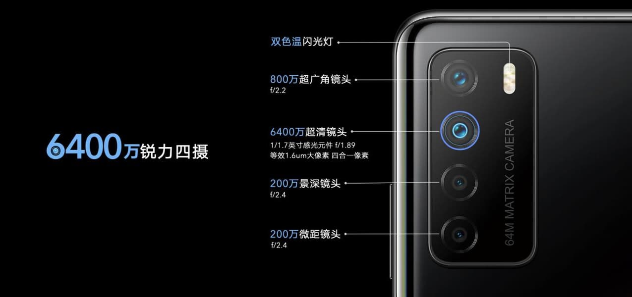 Четверная основная камера сочетает главный 1/1,7-дюймовый датчик на 64 Мп, ультраширокоугольный модуль на 8 Мп с диафрагмой f/2,2, датчик глубины на 2 Мп с диафрагмой f/2,4 и макромодуль на 2 Мп с диафрагмой f/2,4.