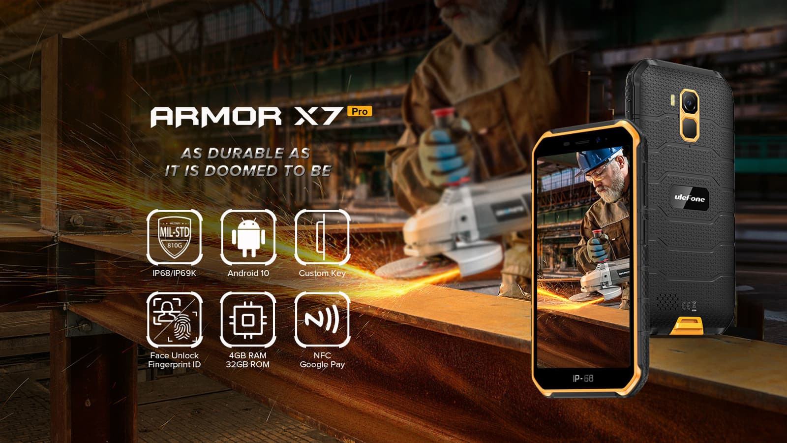 Ulefone Armor X7 Pro соответствует требованиям американского военного стандарта MIL-STD-810G, а также степени защиты IP69K. Устройство, защищенное в соответствии с требованиями класса IP68, может выдержать погружение на глубину до 1,5 м в течение получаса. Согласно описанию класса защиты IP69K, соответствующее устройство также может работать в условиях высокотемпературной мойки под воздействием высокого давления воды.