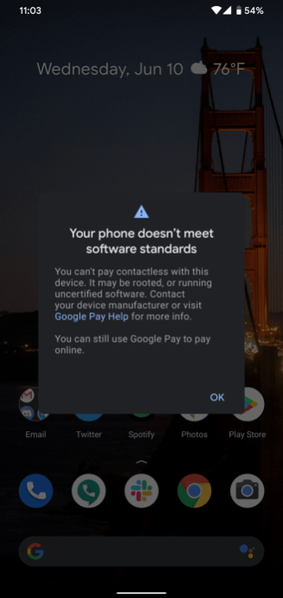 Настройка Google Pay при первом запуске оборачивается неудачей при подтверждении новой карты для платежей в магазинах. Если Google Pay был настроен перед установкой бета-версии, то сначала он работает, а затем начинает выдавать оповещение «Your phone is no longer ready for contactless payments» (Ваш телефон больше не готов для бесконтактных платежей).