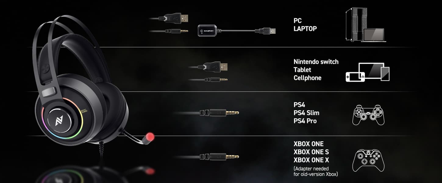 Импеданс наушников — 32 Ом, чувствительность — 122 дБ. Диапазон частот заявлен равным 20-20 000 Гц, а максимальная мощность — 30 мВт. На низких частотах звук дополняется вибрацией амбушюров. Микрофон на гибком креплении характеризуется импедансом 2,2 кОм и чувствительностью -42 дБ. Масса изделия равна 335 г. Для звукового подключения гарнитура оснащена кабелем с разъемом диаметром 3,5 мм, а питание подсветки поступает через разъем USB. В кабель врезан пульт управления с регулятором громкости и двумя выключателями. Один управляет микрофоном, другой — функцией вибрации.