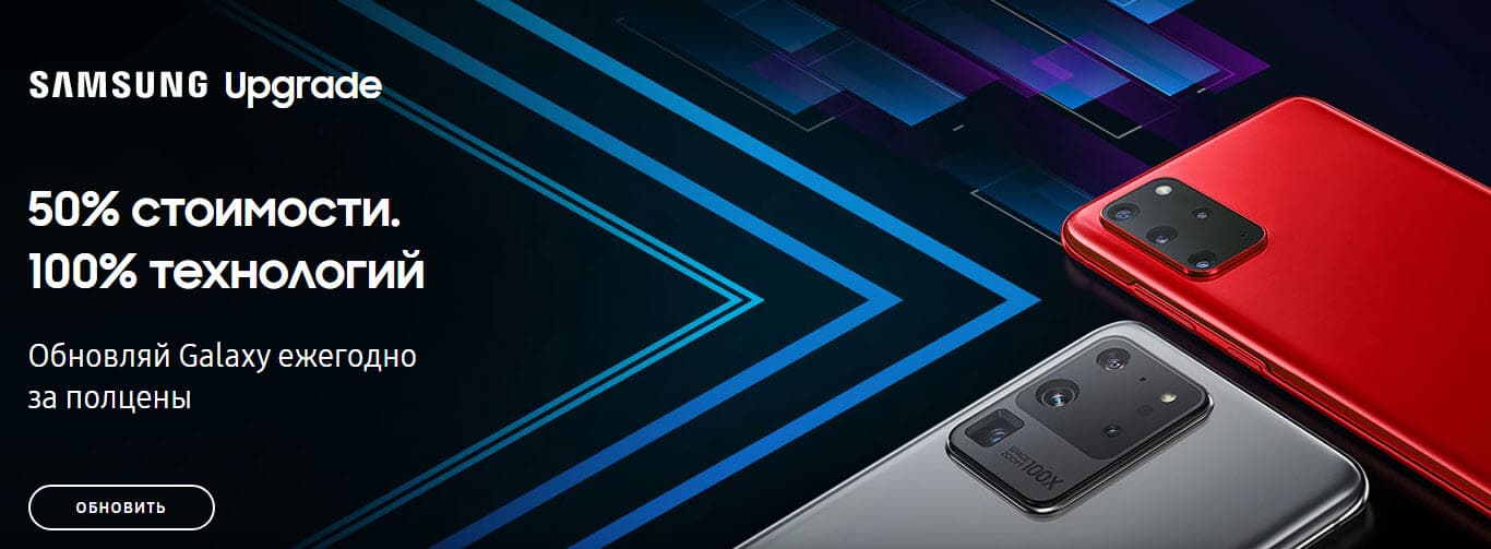 По программе Samsung Upgrade можно получить смартфон бесплатно по всей России, а также скидку 50% от полной стоимости устройства при обновлении своего Samsung Galaxy через год. Например, год использования Galaxy S20 обойдется в 33 595 вместо 69 990 рублей.