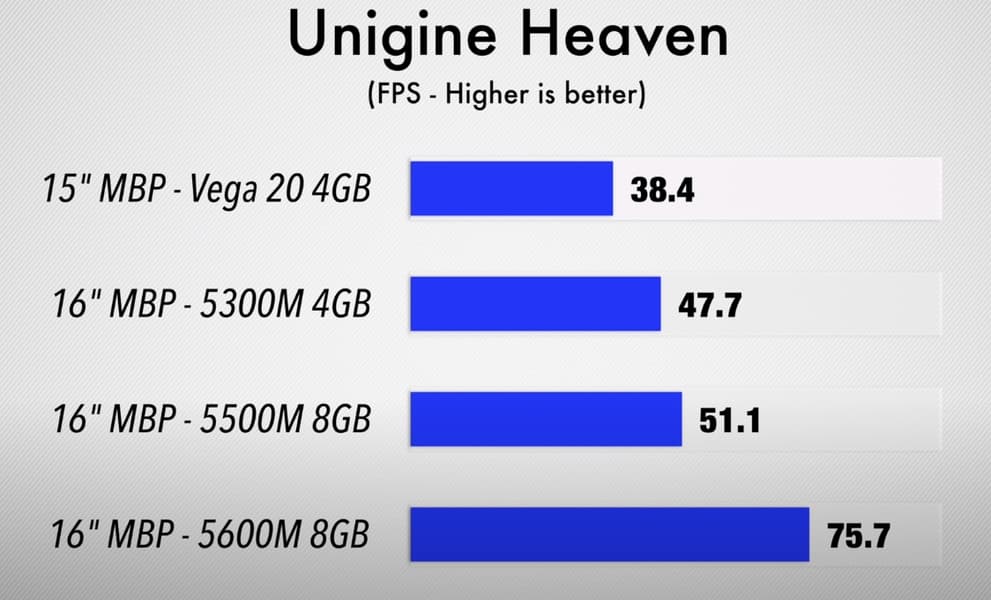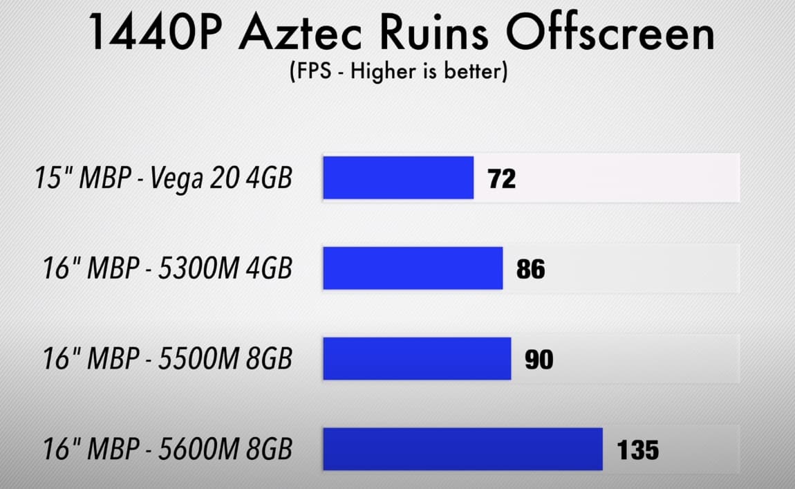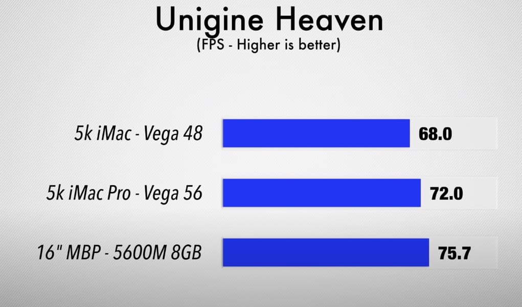 А ещё весьма любопытно смотрится сравнение с 13-дюймовым MacBook Pro с внешней видеокартой Radeon RX 5700 XT, где эта связка оказывается несколько медленнее. И хотя в целом macOS — это система совершенно не для игр, всё же при желании MacBook Pro 16 с Radeon Pro 5600M можно использовать для этих целей более чем успешно.