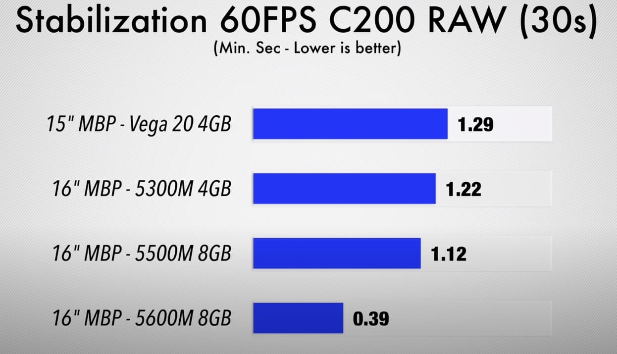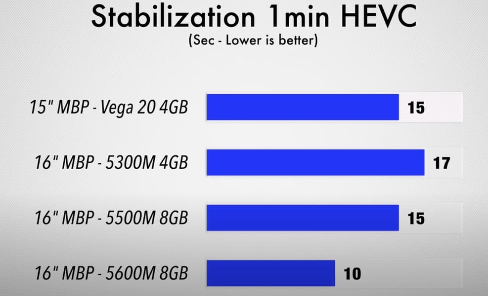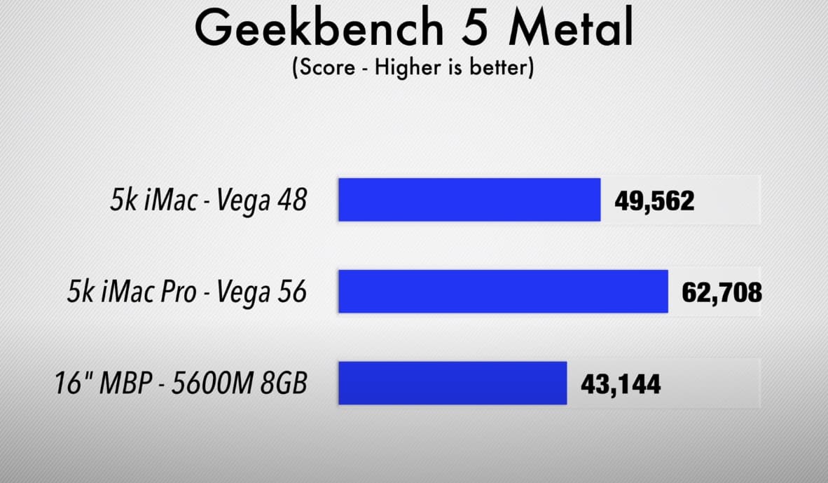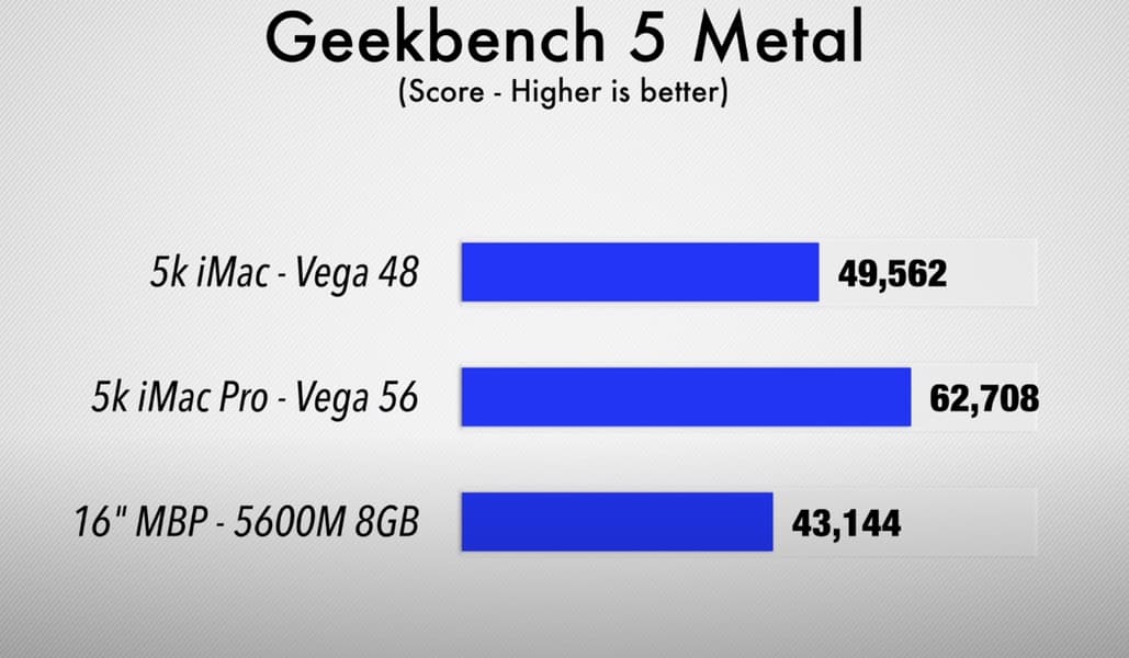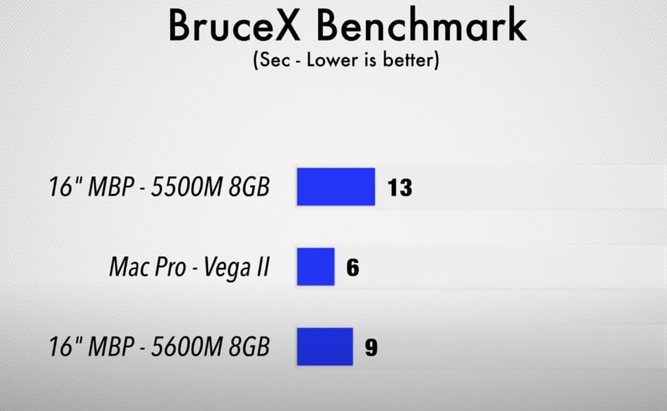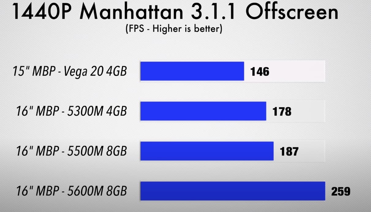 Как видим, Radeon Pro 5600M примерно в полтора раза быстрее Radeon Pro 5500M, которая ранее была топовой для ноутбука Apple. А порой превосходство намного значительнее. При этом новая карта способна порой тягаться с Radeon Pro Vega 48 и даже Vega 56 в моноблоках iMac, хотя, конечно, далеко не всегда.
