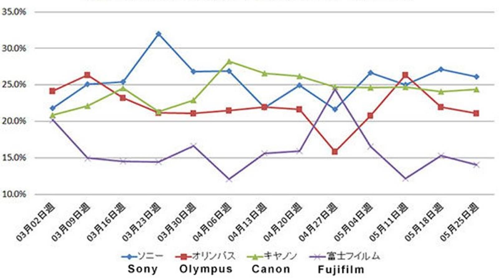 Производители ощущают падение продаж в разной степени. Камер Canon было продано 25,8% от майского уровня 2019 года, камер Sony — 39,2%, камер Olympus — 39,0%. Интересно, что на этом уровне компания Fujifilm сохранила продажи почти на прошлогоднем уровне (91.8%). Динамика распределения основной части рынка между этими четырьмя участниками в период со 2 марта по 25 мая показана на иллюстрации.