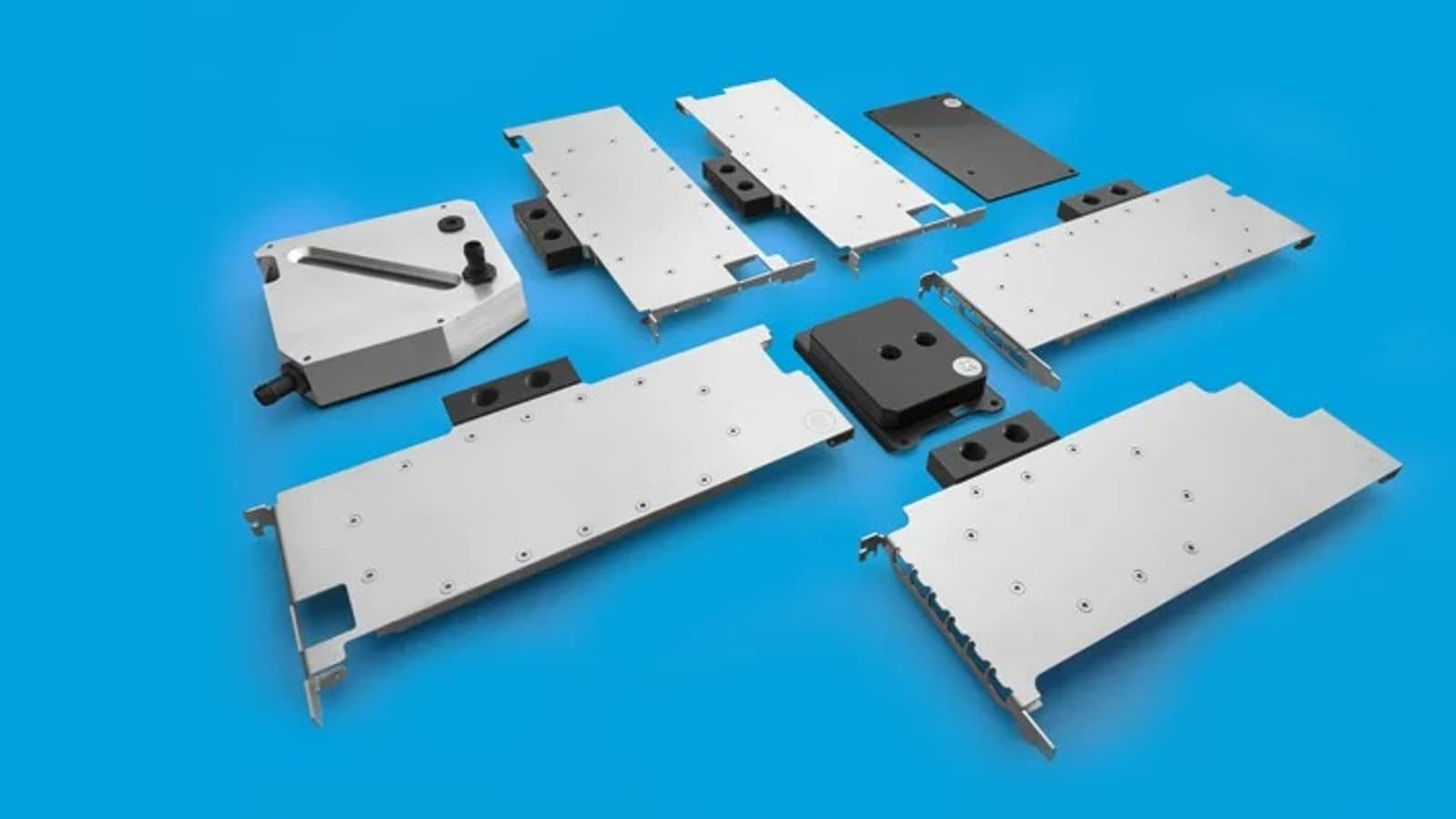 Основания водоблоков изготавливается из меди и защищается никелированием, а материалом крышек служит нержавеющая сталь. Для подключения к системе используются стандартные порты G1/4". Интересной особенностью является интеграция в крышку водоблока монтажной планки, заменяющей штатную. По словам производителя, этим обеспечивается дополнительная жесткость конструкции.