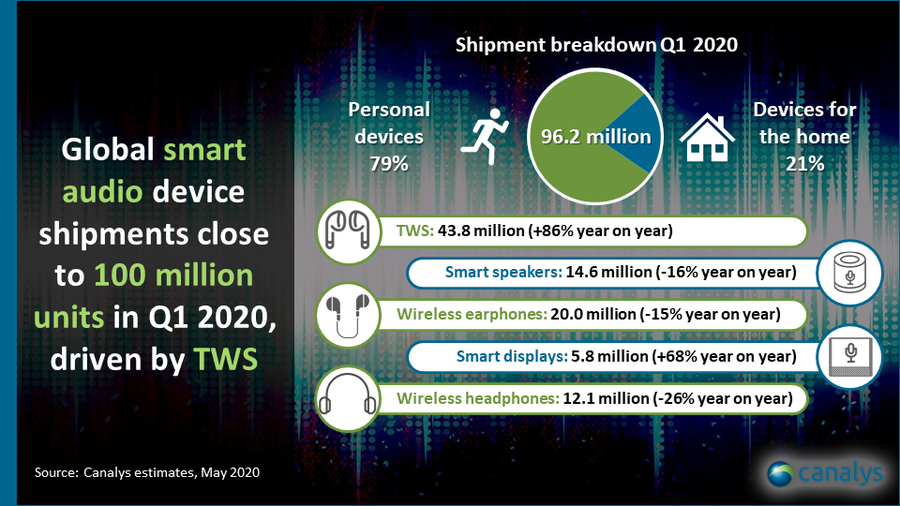 Также аналитики Canalys отмечают, что рынок умных аудиоустройств по итогам первого квартала вырос до 96,2 млн единиц. Сюда источник относит все виды беспроводных наушников, умные колонки и смарт-дисплеи. Причём из-за пандемии коронавируса сегмент умных колонок впервые в своей истории просел на 16%, до 20,3 млн штук.