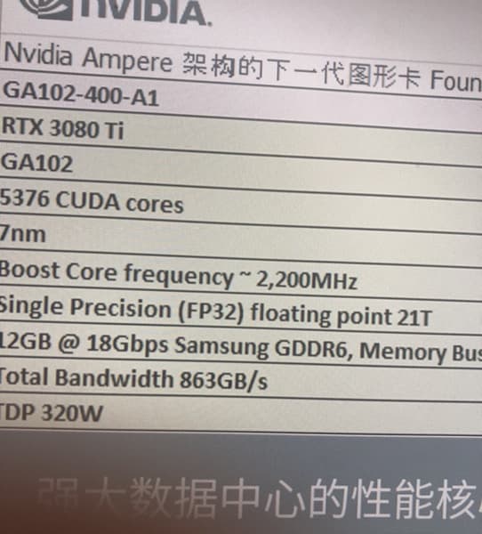 Если эти данные подтвердятся, то GeForce RTX 3080 Ti, построенная на GPU GA102-400-A1 (а это топовый вариант GPU GA102), получит 5376 ядер CUDA, а максимальная частота графического процессора составит внушительные 2,2 ГГц. Также видеокарте приписано 12 ГБ памяти GDDR6 производства Samsung со скоростью 18 Гбит/с. Техпроцесс – ожидаемый 7-нанометровый, а вот уровень TDP приличный – 320 Вт.