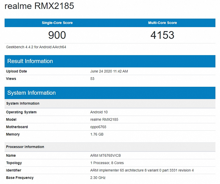 И теперь эти сомнения подтвердились. Новинка Realme засветилась в Geekbench 4, набрав там 900 и 4153 балла в однопоточном и многопоточном режимах соответственно. И это мало. Примерно столько же набирает очень старая Snapdragon 625, а более свежая, но очень бюджетная Helio P22 отстаёт не особо сильно.
