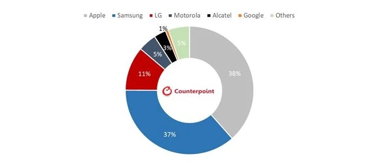 Согласно данным Counterpoint, по итогам первого квартала Samsung заняла 37% этого сегмента, а Apple — 38%. Ещё 11% пришлось на LG, 5% — на Motorola, 3% было у Alcatel и 1% — у Google.