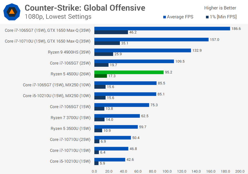 Благо, специалисты TechSpot опубликовали именно такой обзор APU Ryzen 5 4500U — второго по старшинству в линейке. Напомним, это шестиядерный процессор без поддержки SMT с частотами 2,3-4,0 ГГц, GPU Vega 6 и TDP 10-25 Вт. Учитывая отсутствие поддержки SMT, по параметрам конкурентами для него можно считать и топовый четырёхъядерный 10-нанометровый Core i7-1065G7, и топовый шестиядерный 14-нанометровый Core i7-10710U. Однако это лишь по параметрам. Что же в реальности?