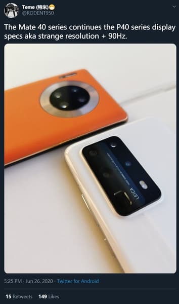Как пишет инсайдер в Twitter (ранее он уже неоднократно отметился правдивыми утечками о разных моделях Huawei), компания будет использовать в Mate 40 экран «со странным разрешением» и кадровой частотой 90 Гц. Под странным разрешением, судя по всему, следует понимать разрешение 2640 на 1200 пикселей – как в P40.