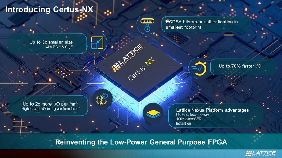 Компания Lattice Semiconductor представила новое семейство программируемых вентильных матриц (FPGA) общего назначения, построенных на платформе Lattice Nexus. Новые FPGA характеризуются пониженной потребляемой мощностью, а по числу цепей ввода-вывода в расчете на единицу площади кристалла они вдвое превосходят конкурирующие решения. К другим достоинствам FPGA семейства Certus-NX отнесена высокая надежность, небольшие размеры и поддержка PCIe и Gigabit Ethernet, а также высокое быстродействие: цепи ввода-вывода конфигурируются за 3 мс, весь прибор — за 8 мс.