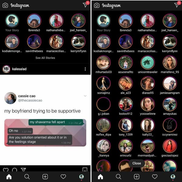 На данный момент в приложении Instagram «Истории» показываются в один ряд над «Лентой». В новом интерфейсе «Истории» не только выводятся в два ряда, но и появилась кнопка See all Stories (Посмотреть все Истории), которая ведёт на страничку, где собраны все «Истории», опубликованные за последние 24 часа пользователями, на которых вы подписаны.