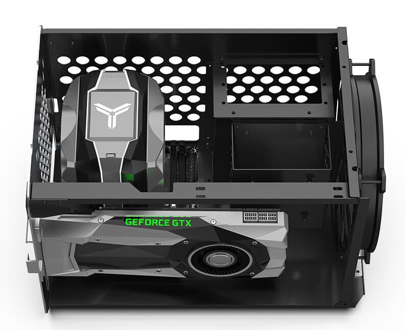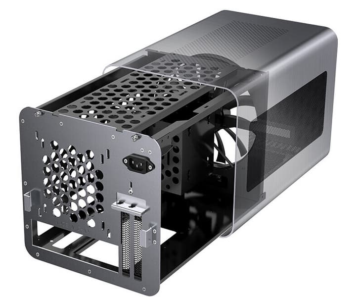 Помимо системной платы в Jonsbo V8 помещается видеокарта длиной до 33 см и шириной более двух слотов. Высота процессорной системы охлаждения может быть до 19,5 см. Внутри корпуса отведено место для блока питания типоразмера SFX или SFX-L. Что касается накопителей, есть возможность разместить два устройства типоразмера 3,5 дюйма и одно устройство типоразмера 2,5 дюйма.