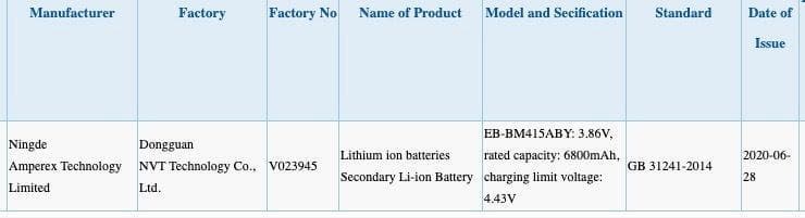 Как пишет источник, в базе китайского регулятора 3С обнаружился новый элемент питания для смартфонов Samsung с серийным номером EB-BM415ABY. Его емкость – 6800 мА·ч, напряжение – 4,43 В. Вероятно, компания предложит со смартфоном, в котором будет использоваться такой аккумулятор, зарядное устройство мощностью 15 Вт. Ну а сама маркировка указывает на использование аккумулятора в Galaxy M41.