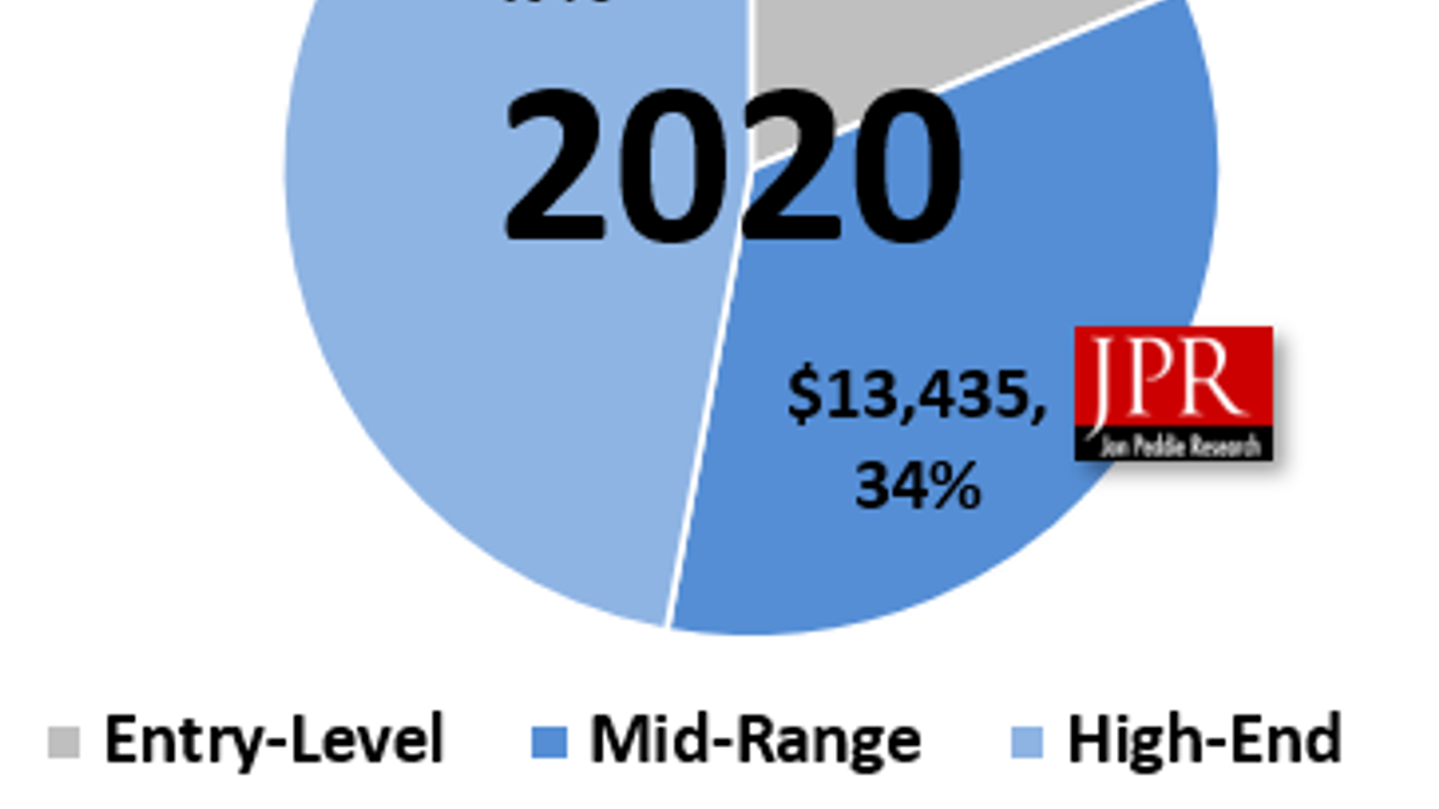 Прогнозируется, что продажи в начальном сегменте в 2020 году вырастут на 21,7%, что является беспрецедентным и совершенно неожиданным. В среднем сегменте прекратилось сокращение продаж, а в верхнем сегменте появление доступных мониторов разрешением 1440p+ вызвало цепную реакцию модернизации, поскольку геймеры хотят видеть частоту обновления экрана не менее 60 к/с даже в максимальном разрешении. Распределение рынка по сегментам показано на диаграмме.