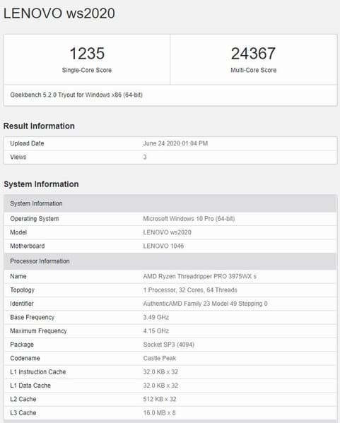Интересно, что рабочая станция Lenovo, построенная на этом CPU, засветилась в Geekbench еще 24 июня, но соответствующая запись обратила на себя внимание только сейчас. Как видно, CPU работает на частоте 3,5-4,15 ГГц и имеет 128 МБ кэш-памяти третьего уровня. Частоты ниже, чем у настольного аналога Threadripper 3970WX, но у Threadripper PRO 3975WX другая специфика применения, к тому же процессору, как и всей линейке Threadripper PRO 3000, приписывают восьмиканальный контроллер оперативной памяти с поддержкой до 2 ТБ ОЗУ.