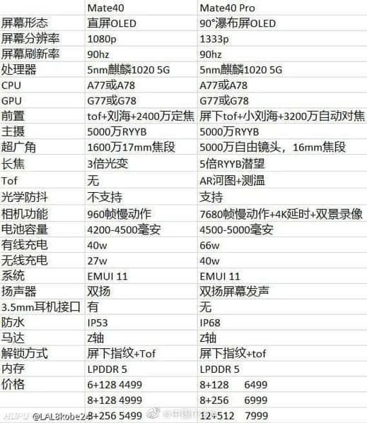 Разными будут и камеры, хотя главный датчик будет идентичным. Это сенсор разрешением 50 Мп, вероятно, такой же, как используется в линейке P40. Mate 40 также получит 16-мегапиксельный «ширик» и какой-то «телевик» с трёхкратным оптическим зумом. Mate 40 Pro в дополнение к главному датчику сможет похвастаться ещё одним таким же, но уже со сверхширокоугольным объективом. Также будет «телевик» с пятикратным зумом и датчик ToF. Фронтальная камера младшей модели будет включать 16-мегапиксельный датчик и датчик ToF, а старшей — 32-мегапиксельный датчик и датчик ToF. При этом сохранится вырез в экране в виде чёлки, но у старшей модели он якобы будет меньше. Ещё одно важное отличие — защита от воды и пыли. У Mate 40 это IP53, у Mate 40 Pro — IP68.