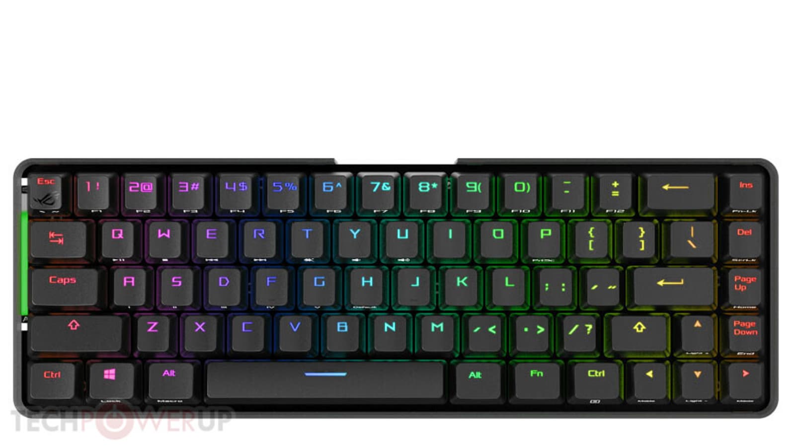 Раскладка ROG Falchion включает 68 клавиш. Как видно на иллюстрациях, конструкторы пожертвовали отдельными клавишами навигации и рядом функциональных клавишам. С другой стороны, добавлен новый орган управления — сенсорная полоска, которую можно использовать как ползунок, например, для регулировки громкости или прокрутки.