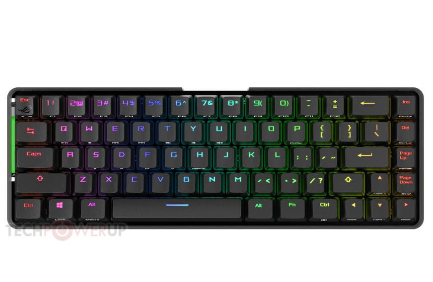Раскладка ROG Falchion включает 68 клавиш. Как видно на иллюстрациях, конструкторы пожертвовали отдельными клавишами навигации и рядом функциональных клавишам. С другой стороны, добавлен новый орган управления — сенсорная полоска, которую можно использовать как ползунок, например, для регулировки громкости или прокрутки.