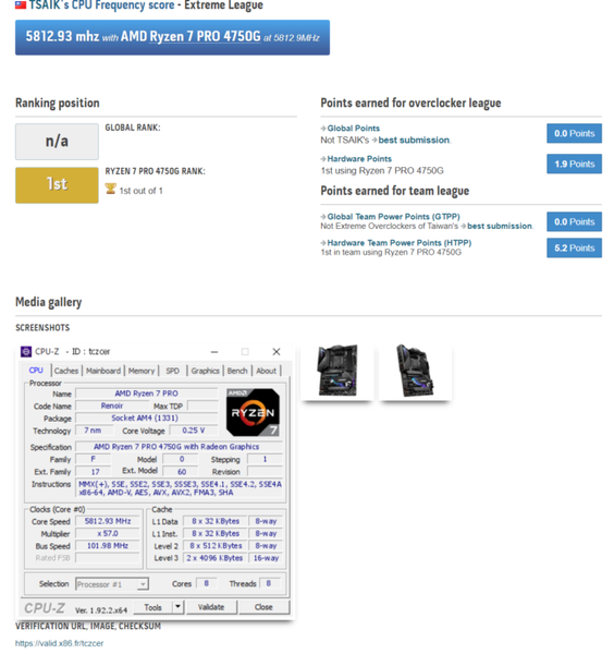 AMD Ryzen 7 4750G прошел через руки нескольких оверклокеров. Первые выжали все соки из CPU – и заставили его работать на частоте 5,8 ГГц (при стандартном максимуме 4,4 ГГц). Правда, при этом работали только четыре ядра из восьми, но все равно результат хорош. В этом случае использовалась материнская плата MSI MPG B550 Gaming Carbon.