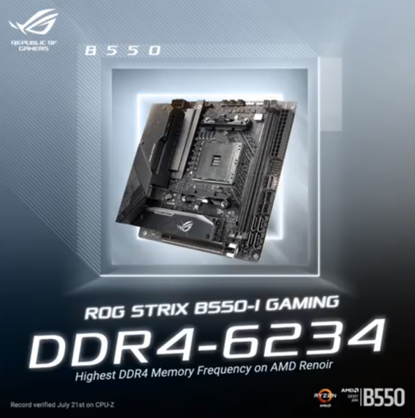 Во втором случае акцент был сделан на разгоне памяти – двух модулей Crucial Ballistix DDR4-2666 МГц объемом 8 ГБ каждый. При этом использовалась материнская плата Asus ROG STRIX B550-I Gaming. Частота процессора была понижена до 2,5 ГГц при напряжении 1,232 В, но это не главное, а главное – частота памяти. Она составила 3117,4 МГц или DDR4-6234 при таймингах 24-27-27-58-127-1T.