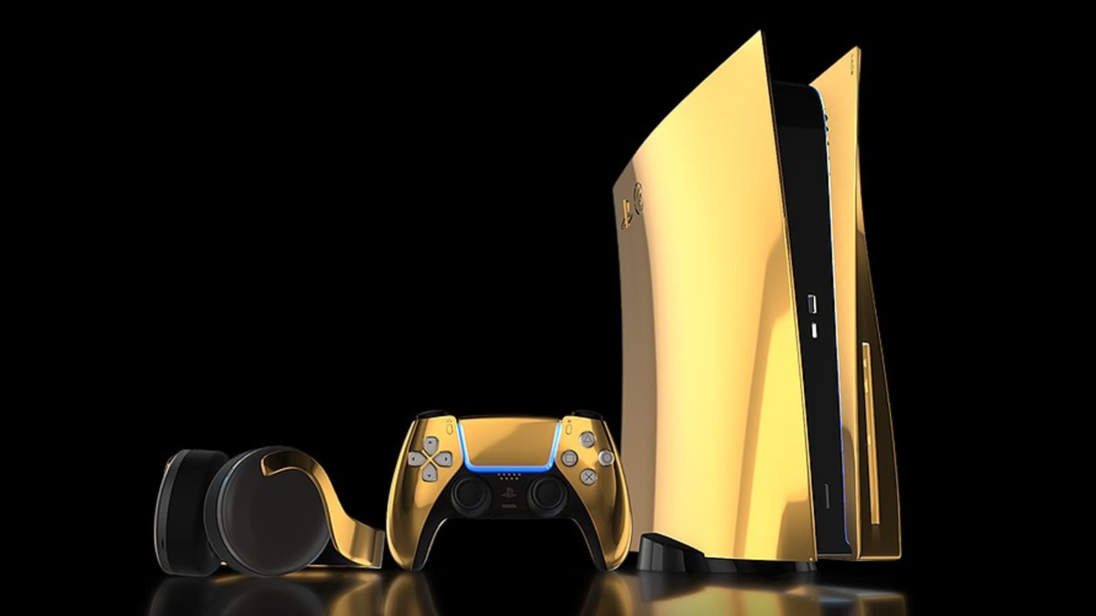 Корпус такой PlayStation 5 отделан 24-каратным золотом, в комплекте идут аналогичные по стилю контроллер и гарнитура. Также есть варианты с отделкой платиной и розовым золотом.