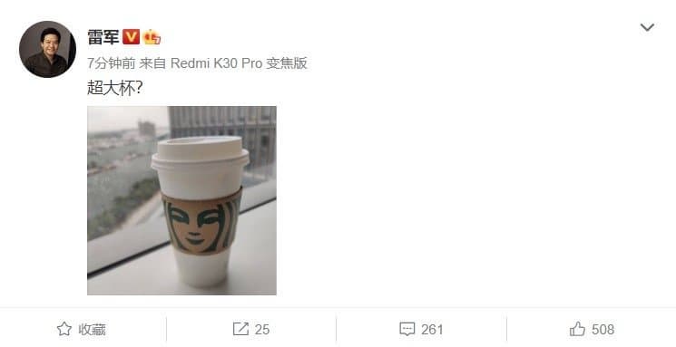Еще в середине июня директор по новым продуктам Xiaomi Ван Тенг Томас (Wang Teng Thomas) анонсировал относительно скорый анонс нового флагмана компании, обозначенный кодовым словосочетанием «Супербольшой Кубок». По слухам, ожидается некая спецверсия Mi 10 Pro. И вот сейчас глава компании Лей Цзунь (Lei Jun) намекнул на скорый выпуск этой модели, опубликовав на своей страничке в Weibo фото… стаканчика для кофе.