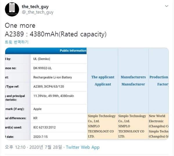 В базах данных корейского и китайского регуляторов обнаружились регистрационные данные новой аккумуляторной батареи, маркировка которой (A2389) говорит о принадлежности Apple. Аккумуляторы с подобной маркировкой устанавливаются в iPhone, и новый элемент питания тоже явно зарезервирован для какого-то смартфона Apple. Эта модель может стать рекордсменом по автономности.