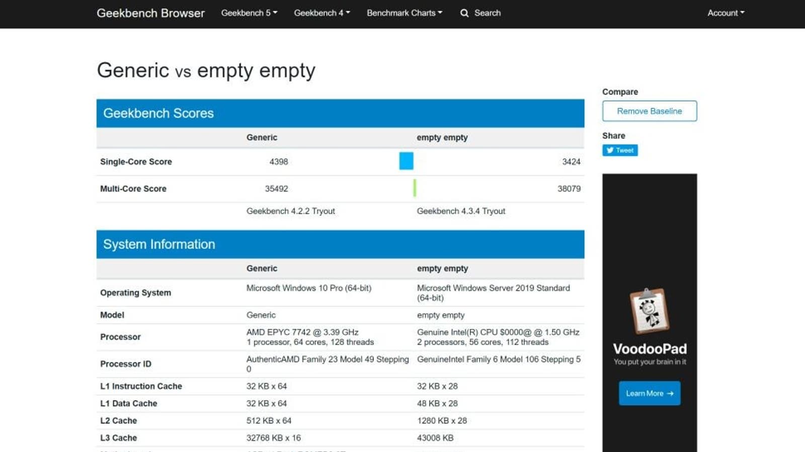 Тестирование прошла двухпроцессорная система, то есть суммарное число ядер было равно 56, а сравнили ее с одним 64-ядерным процессором AMD Epyc 7442. В однопоточном тесте система на двух процессорах Intel набрала 3424 балла. Система на процессоре AMD набрала 4398 баллов. Низкий показатель Intel может объясняться тем, что тестировался инженерный образец, а серийное изделие будет работать на более высоких частотах.