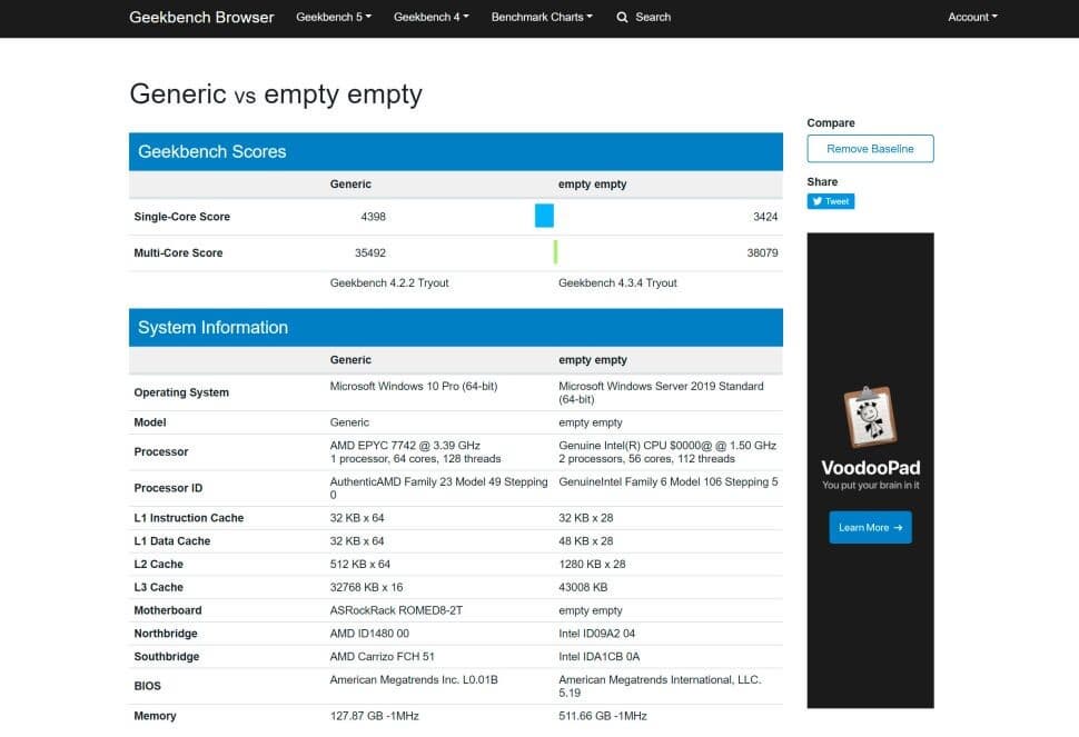 Intel готовит к выпуску 10-нанометровые серверные процессоры Ice Lake-SP следующего поколения. Микроархитектура Golden Cove и наличие до 28 ядер должны обеспечить прирост производительности по сравнению с серверными продуктами поколения Cascade Lake. В сети уже появились результаты теста Ice Lake-SP в сравнении с конкурирующим предложением в лице процессора AMD Epyc поколения Rome. Говоря точнее, в тесте GeekBench 4 появился инженерный образец неизвестной 28-ядерной модели Ice Lake-SP. Процессор способен выполнять до 56 потоков команд. Он работает на базовой частоте 1,5 ГГц, а повышенная частота равна 3,19 ГГц.