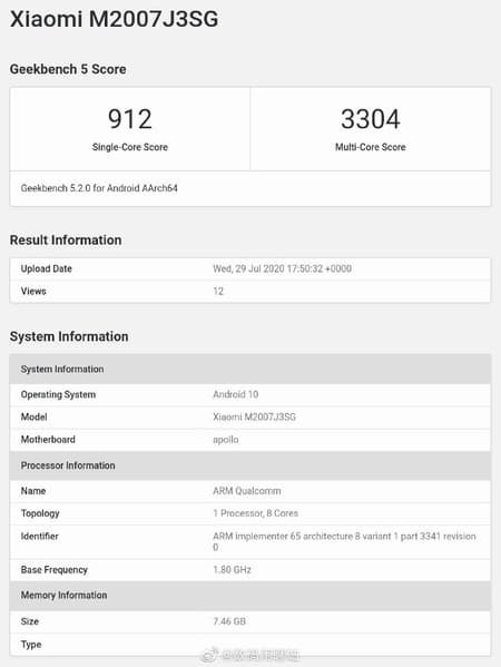 Смартфон с таким обозначением и каталожным номером M2007J3SG засветился в базе бенчмарка Geekbench 5. Он, как видно, получил Android 10 и 8 ГБ оперативной памяти, но по слухам будет еще экран с кадровой частотой 120 Гц и камера разрешением 108 Мп. Увы, на данный момент нет никаких данных о том, что за серийная модель скрывается под обозначением Apollo. Возможно, этот смартфон выйдет в линейке Redmi, а не самой Xiaomi.