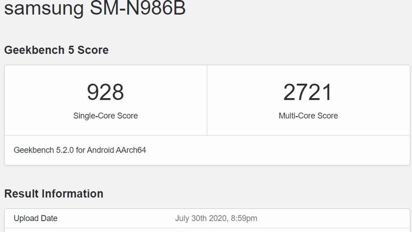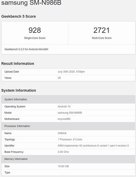 Говорить об этом позволяет бенчмарк Geekbench — в нем отметились оба варианта Galaxy Note20: и на Exynos 990, и на Snapdragon 865. В плане производительности никаких сюрпризов: Snapdragon немного обходит Exynos в однопоточном тесте и гораздо заметнее — в многопоточном. Также можно отметить, что смартфон получил ОС Android 10 и 12 ГБ оперативной памяти.