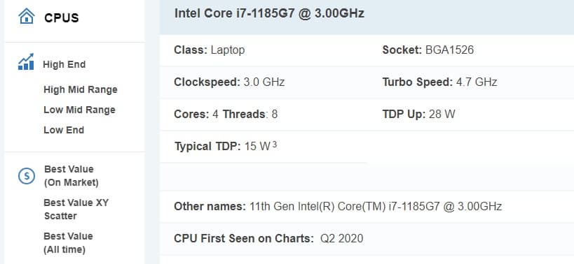 О том, что базовая частота этого процессора составляет 3,0 ГГц, говорилось уже давно, главный вопрос был в максимальной частоте. И теперь она известна — 4,7 ГГц. Это приличное значение для CPU с TDP 15-28 Вт. Процессор получил 4 вычислительных ядра и поддержку многопоточности. Судя по подросшей частоте, Core i7-1185G7 должен обойти в Geekbench Core i7-1165G7, а тот, в свою очередь, в однопоточном тесте обходит 65-ваттный Core i9-10900: почти 1500 баллов против 1300-1400.